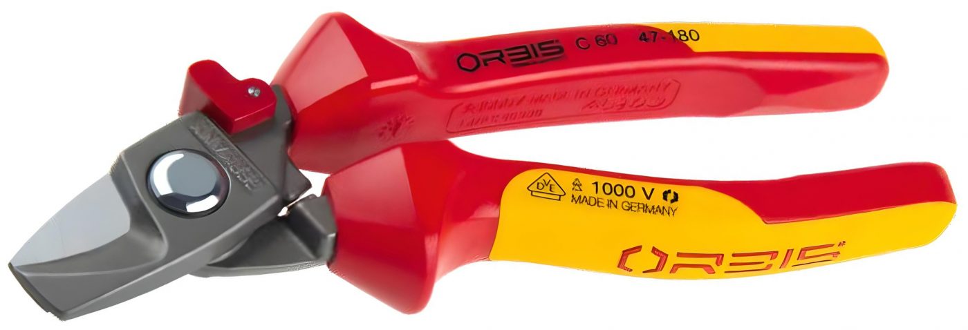 Kìm cắt cáp điện ORBIS 47-1800/RV, ngàm cong, cán cách điện 1000V. Theo tiêu chuẩn VDE. ORBIS sản xuất tại Đức. Thuộc dòng kềm "EvoShark". Thiết kế theo ngôn ngữ công thái học (ergonomics) phù hợp với hình dáng bàn tay. Đầu kềm cong nghiêng 25 độ, giảm thiểu khả năng che khuất tầm nhìn khi cắt.